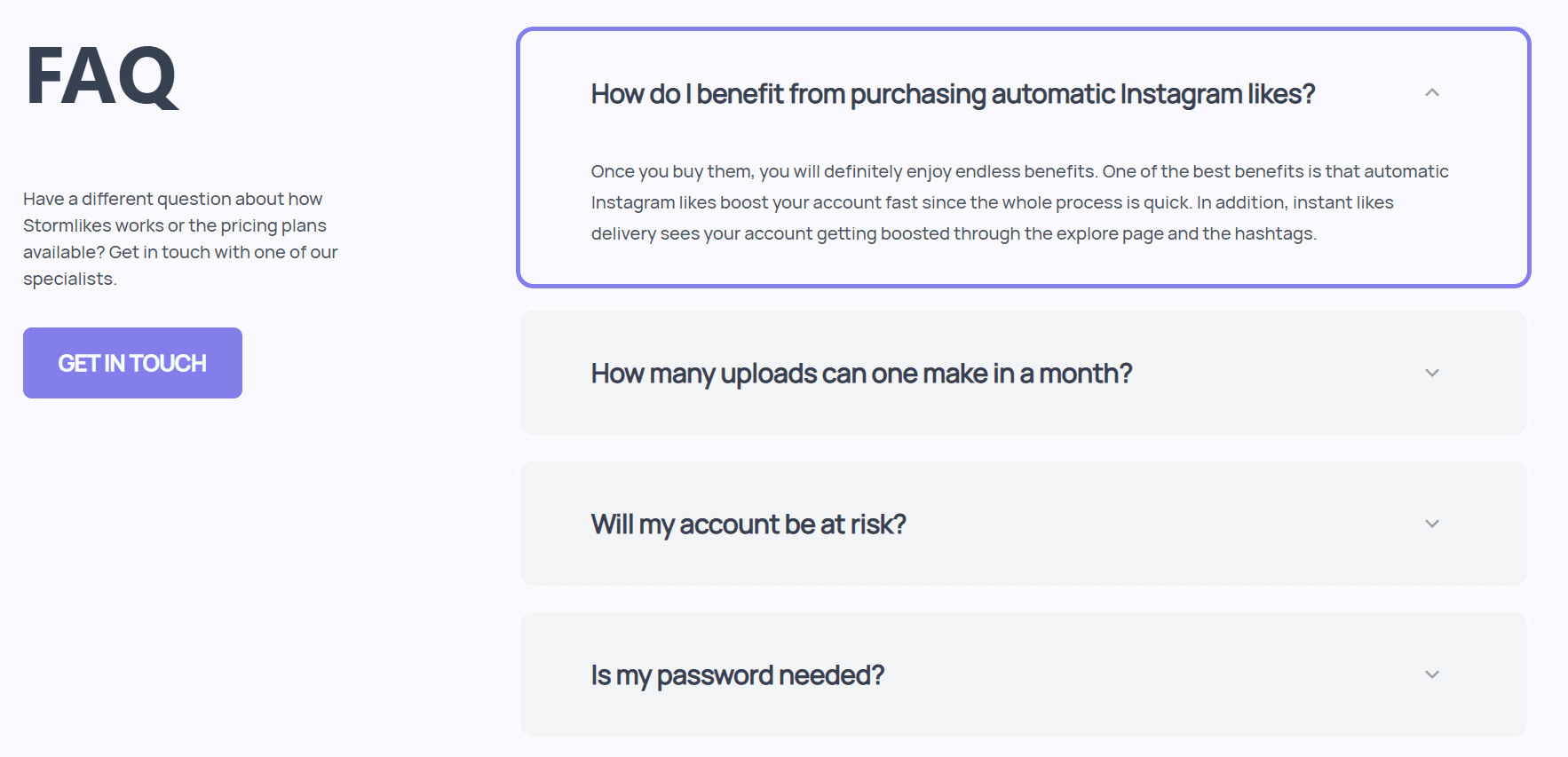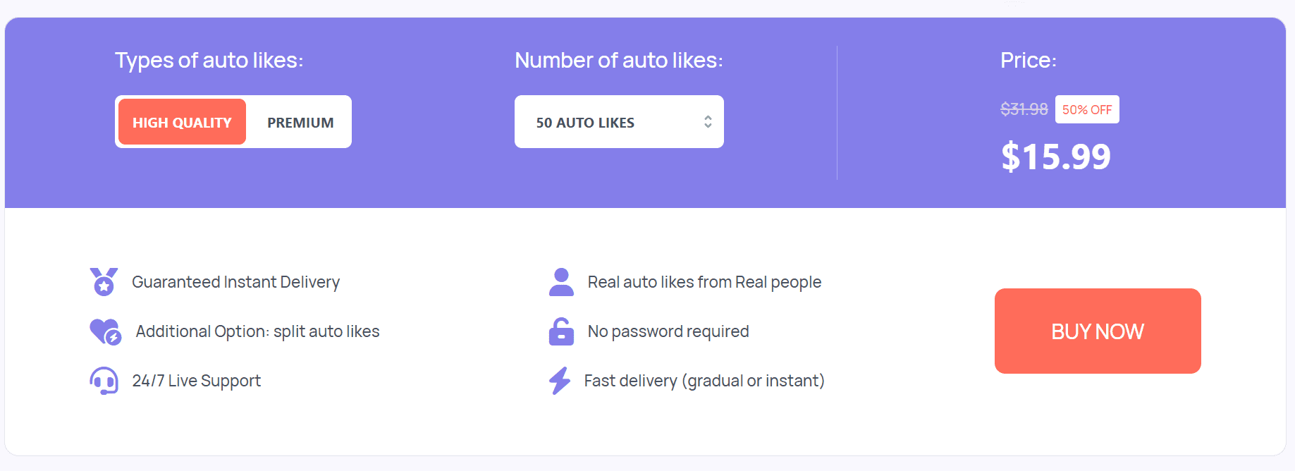 This Instagram automation brand dedicates to the three major networks. Instagram, Twitter, and Facebook are present. Stormlikes landing page is fairly simple. At points, it does not display a professional look. Still, the products are easy to locate. For Instagram, they have fairly few options to set for following. The first one of them is the delivery of likes to the new uploads that appear on a feed. When buying this alternative, the audience starts to appear as soon as the clients pay for them.